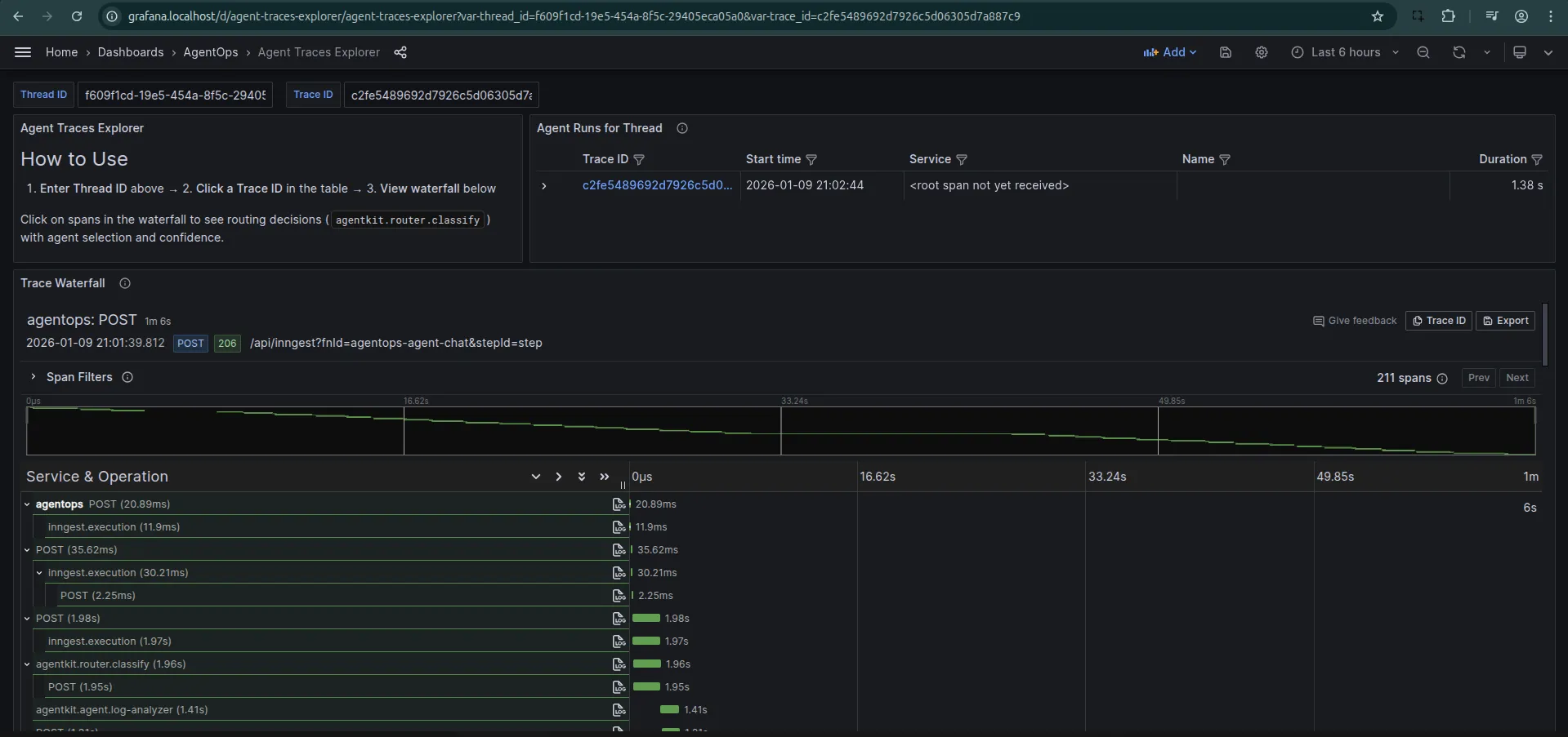 This gives me a waterfall view of the entire agent lifecycle. I can see exactly how long the router took, which tools were called, and where latency spikes are occurring.