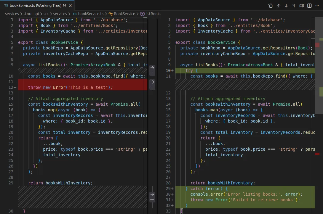 To validate this, I intentionally broke the API. I introduced a bug causing persistent HTTP 500 errors. Then, I gave the Orchestrator a simple prompt: “Can you lookup what’s causing the HTTP 500 error from the store-api book path? Once you find it, please apply a fix.”